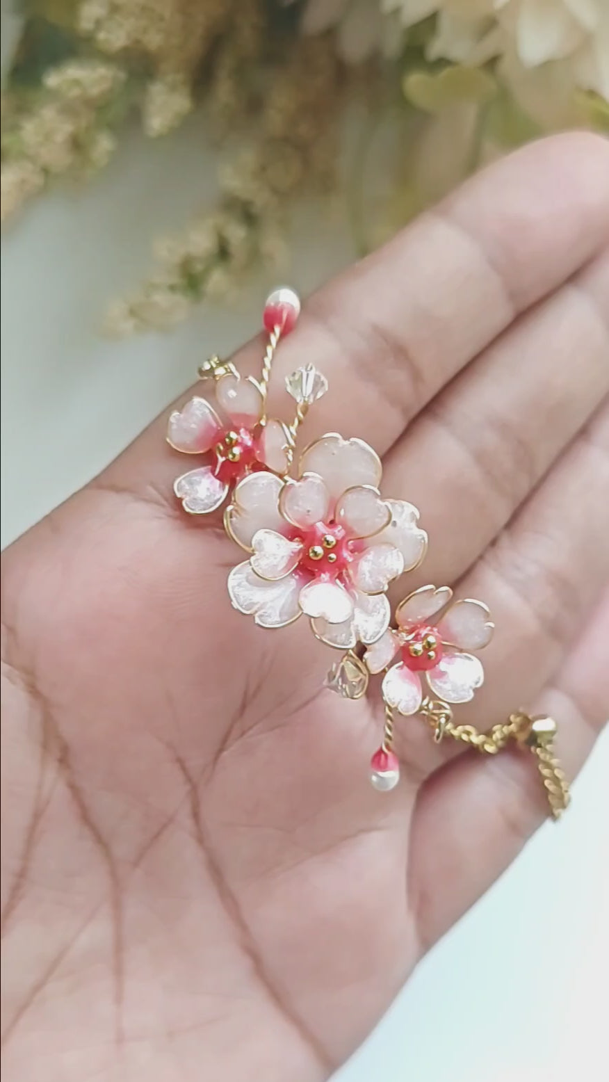 This delicate cherry blossom bracelet is handcrafted with softly shaped floral details inspired by blooming sakura flowers. Finished in gentle pink tones and designed to feel lightweight and graceful, it adds a subtle romantic touch to any look.
