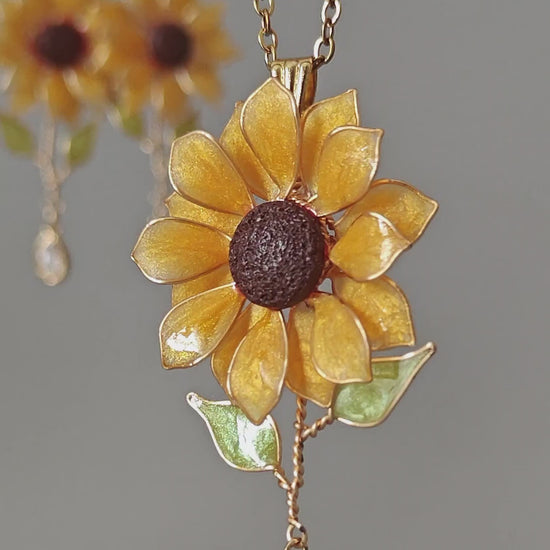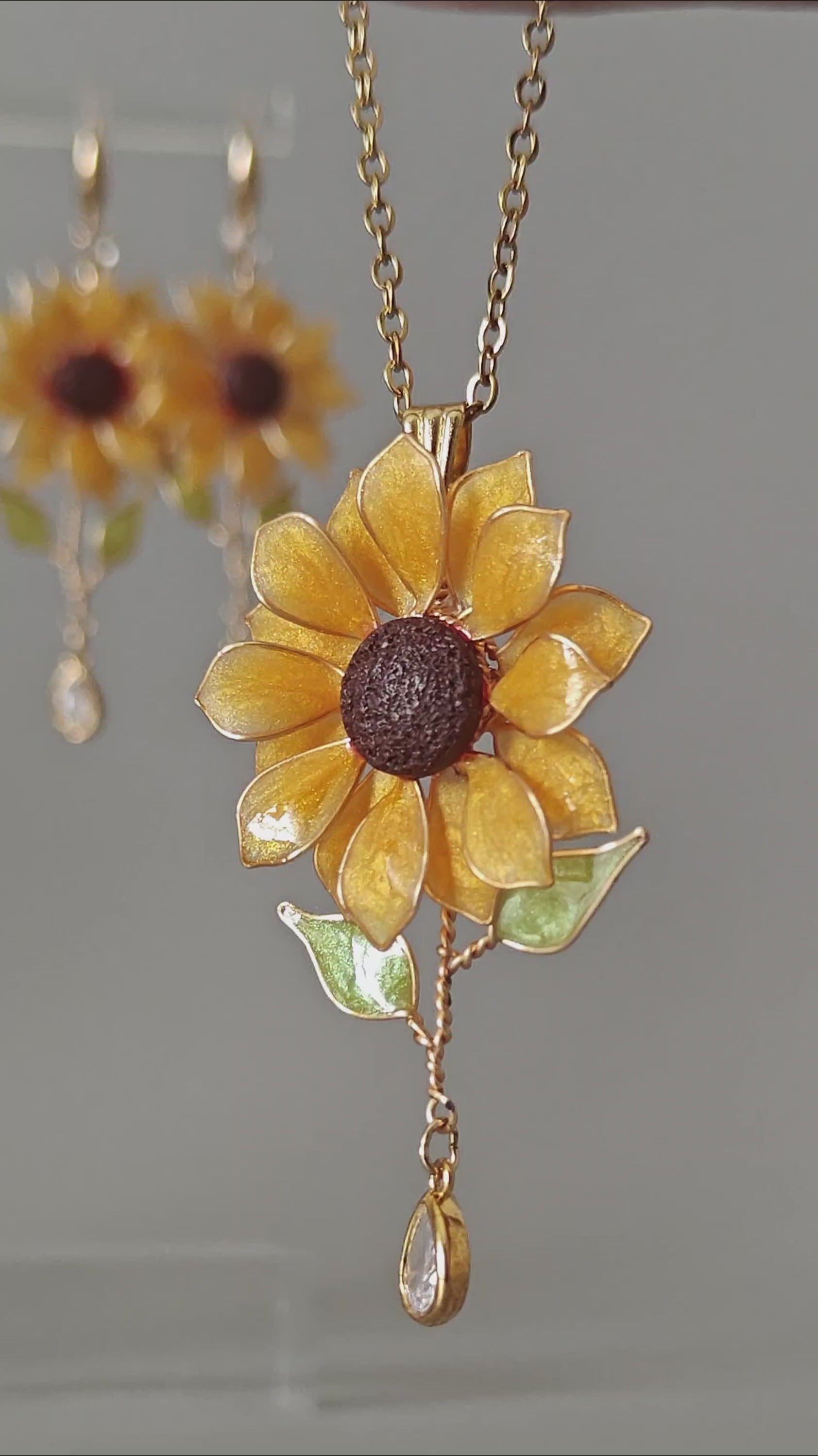 This handmade sunflower necklace features delicate resin petals shaped around a detailed center, inspired by real sunflowers. The pendant hangs from a gold chain with a tiny crystal drop, creating a bright and elegant floral statement piece.