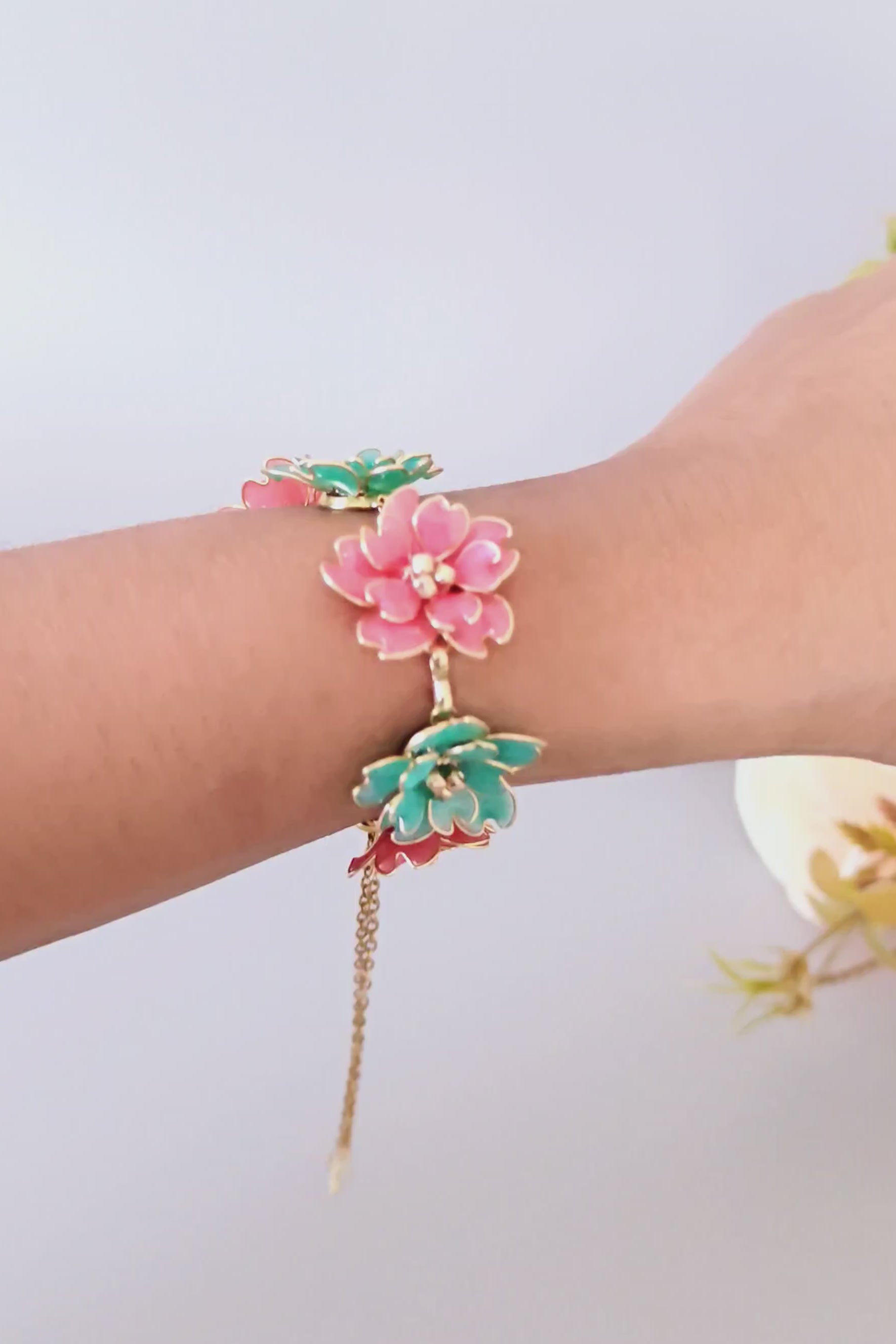 Handmade Floral Bracelet in Pink & Teal – Gold Wire Flower Bracelet
