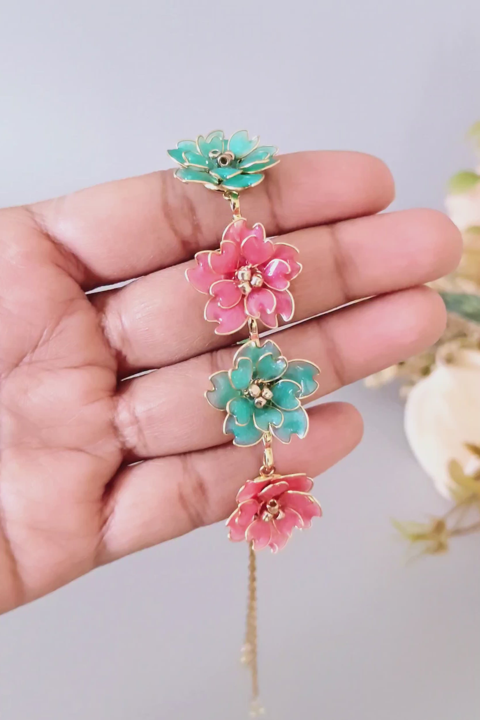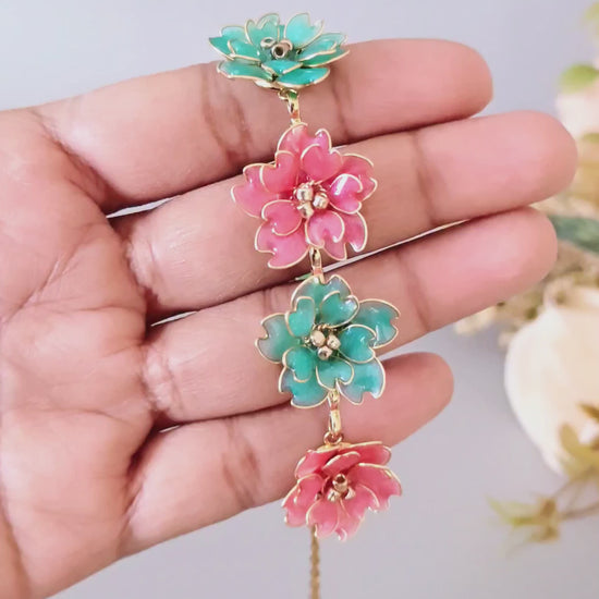 This handcrafted floral bracelet features a delicate arrangement of pink and teal resin flowers connected with gold-toned wire, pearls, and crystal accents. Designed to sit comfortably on the wrist, it adds a graceful floral touch to festive and bridal ensembles. Perfect for weddings, celebrations, and gifting, this bracelet blends elegance with artisanal charm.