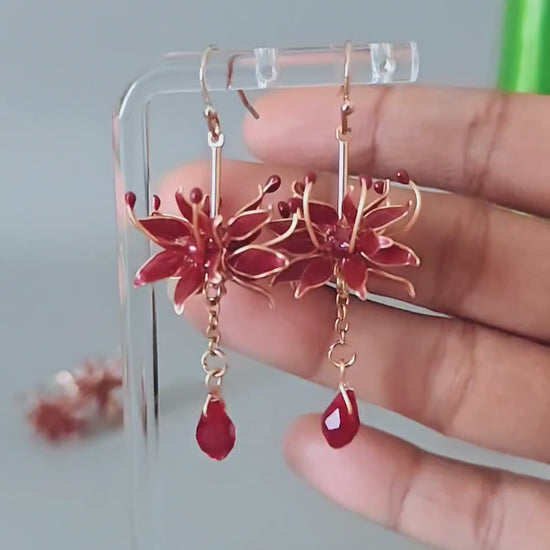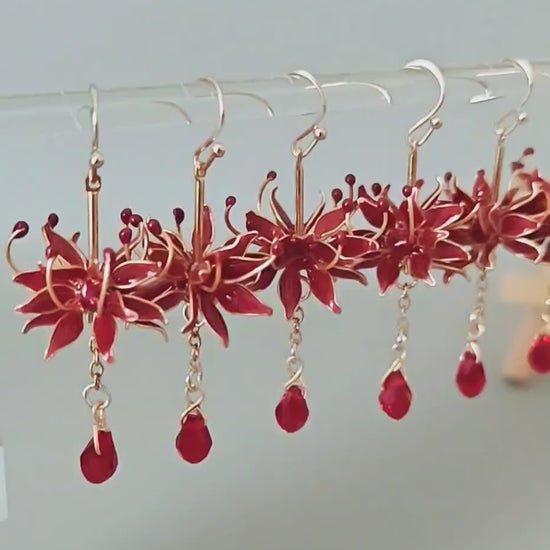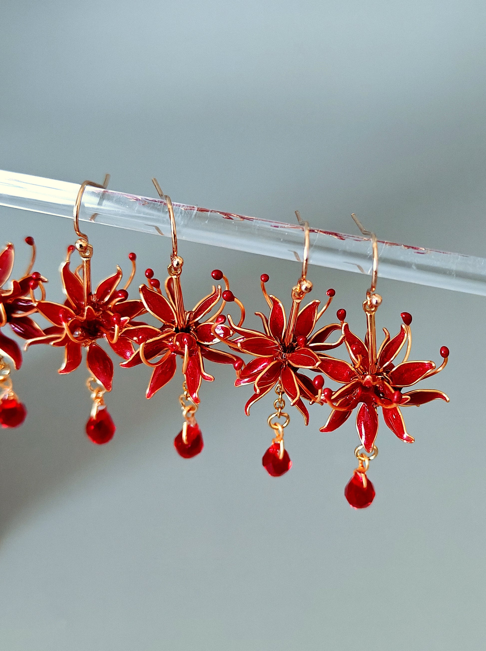 Inspired by traditional Japanese Kanzashi artistry, these handmade Spider Lily earrings capture the elegant beauty of the Higanbana flower. Each petal is shaped by hand using fine wire, dipped in resin, and finished with refined gold-plated findings for a delicate floral look.
