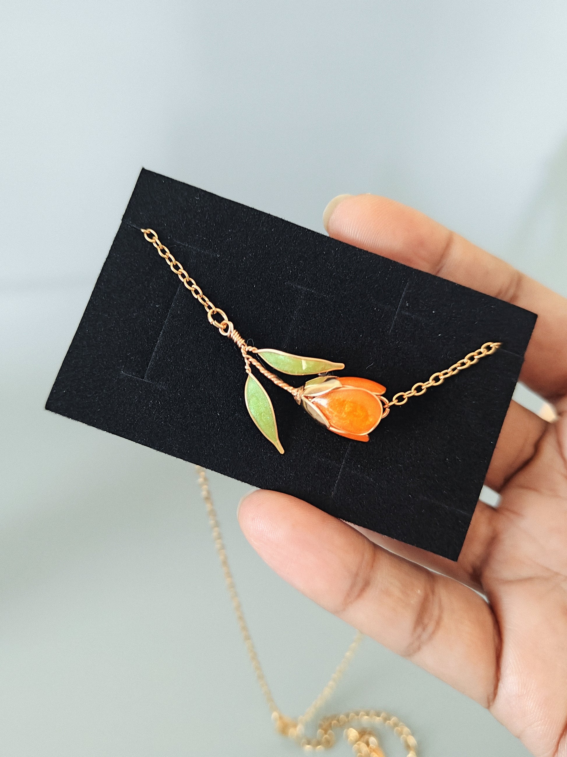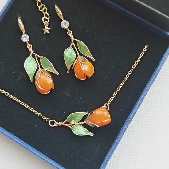 This handmade orange tulip jewelry set includes a matching necklace, earrings, and bracelet designed for a cohesive and elegant floral look. Each tulip is individually handcrafted using fine wire and resin, creating glowing orange blooms accented with soft green leaves.