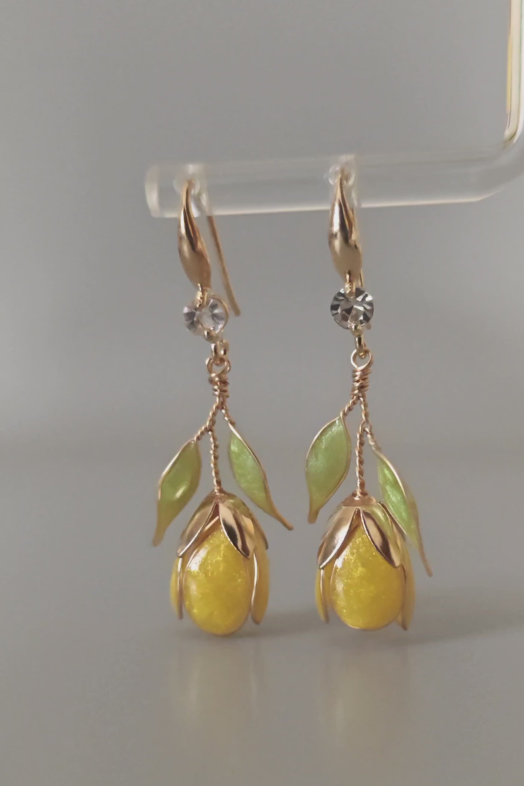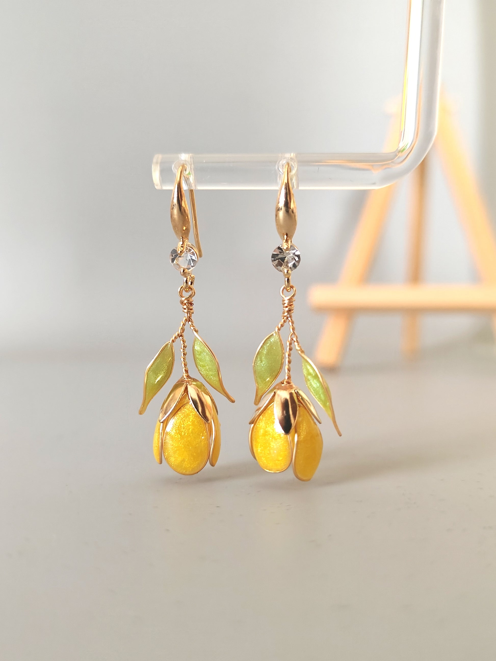 These handmade yellow tulip earrings are inspired by blooming spring gardens and soft floral elegance. Each tulip is shaped using fine wire and resin, creating a luminous yellow bloom accented with gentle green leaves.