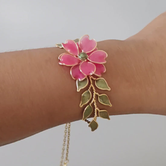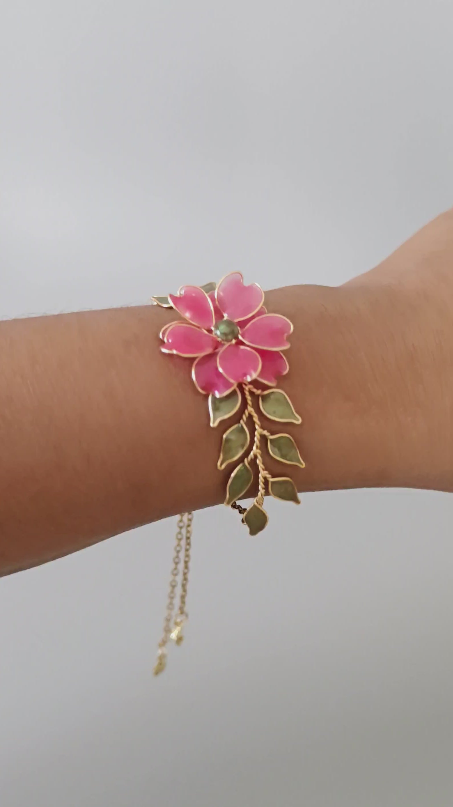 This delicate pink floral bracelet features handcrafted flower details with soft botanical accents, creating an elegant and graceful look. Designed to feel lightweight and comfortable, the adjustable fit makes it easy to wear for both special occasions and everyday styling.