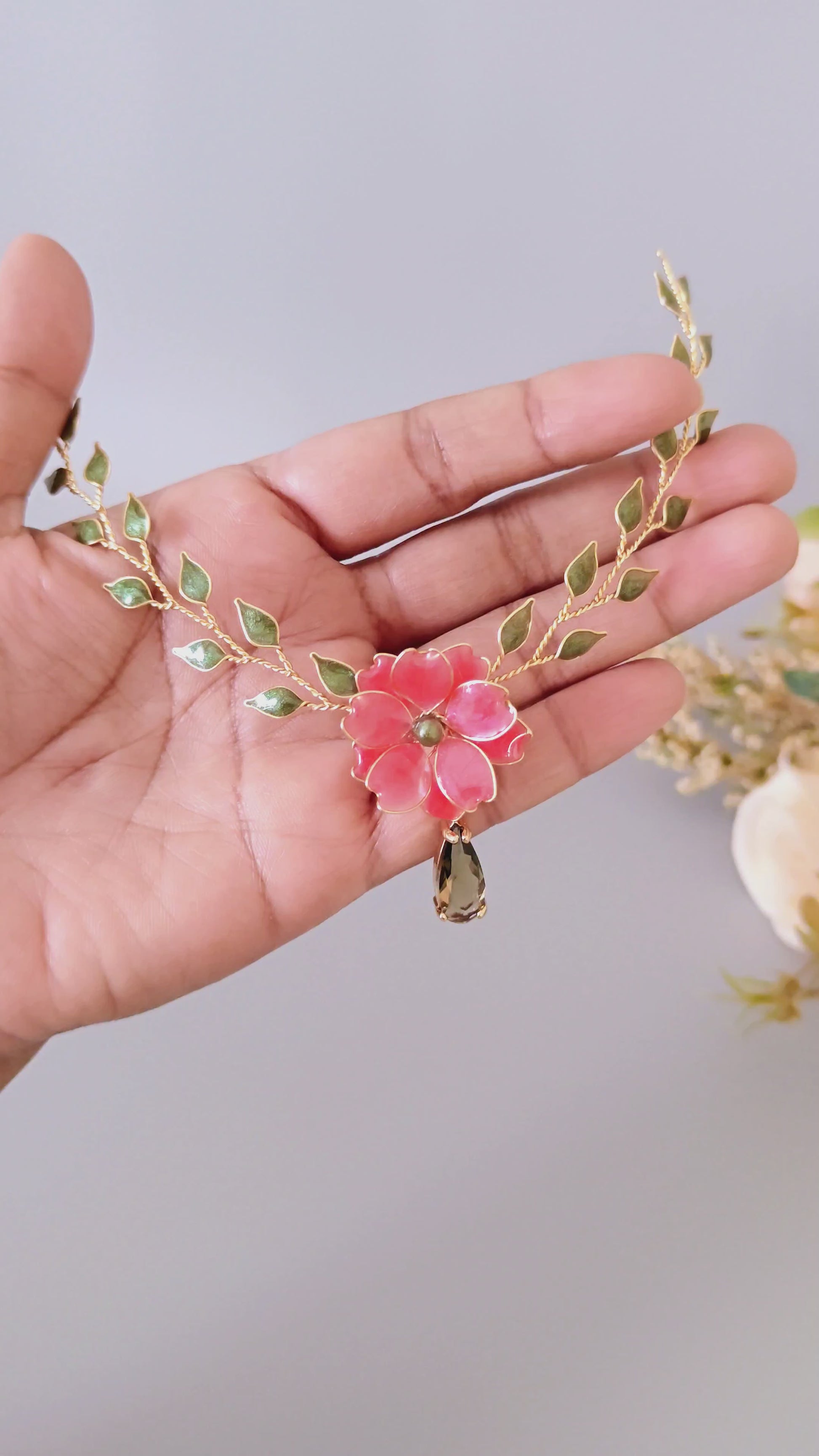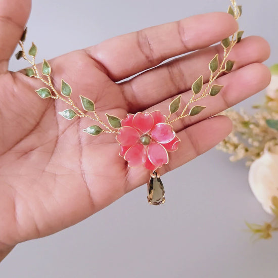This handcrafted pink floral necklace features a delicate flower design inspired by nature, with softly shaped petals, subtle leaf accents, and a graceful drop detail that adds elegant movement. The design feels light, balanced, and refined.